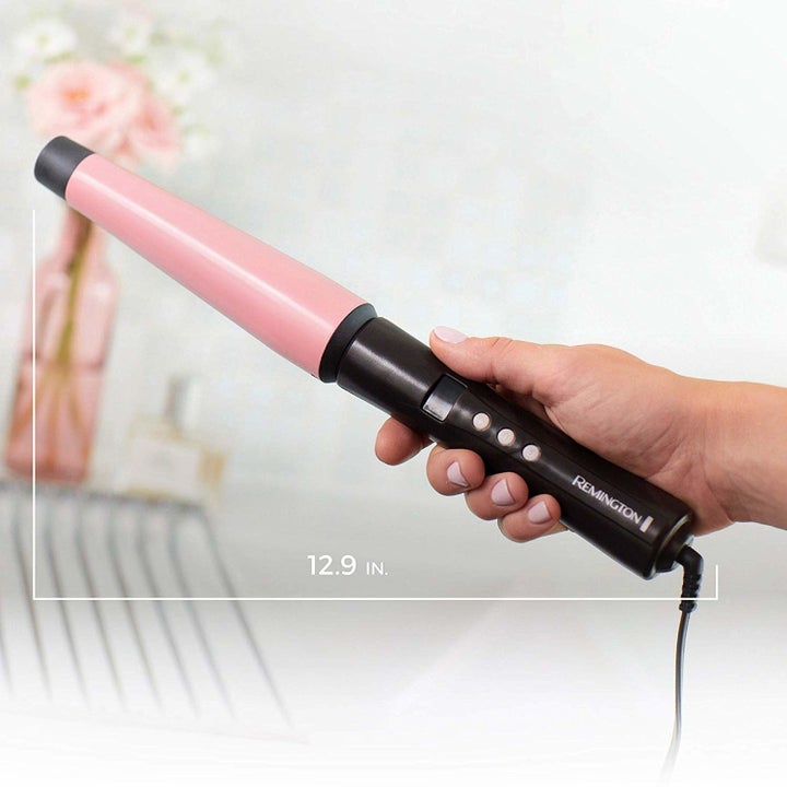 Promising review: "I always envied those who went to school or work every day with their hair curled. With a normal curler, it took me ages to do my hair and it just looked weird on my straight Asian hair. I don't know what it is about this curler, but I'm able to achieve the loose big curls and do it within 10 minutes before work. I'm not the type to spend forever on hair every day. I think since I tend to have the larger part of the barrel towards the top of my head and the skinnier part on the bottom ends, that's what gives it a more natural looking transition from my straight hair at the top which then turns into big curls. This heats up very quickly and with one press of a button. To end this, I just wanted to say that I have several other curling wands from different companies, and I only use this large-barrel Remington wand. It's affordable and a great wand." —Margaret Swan